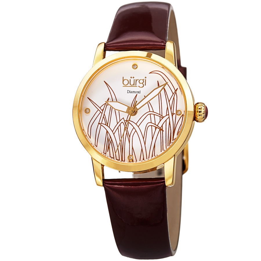 Gold-tone composite metal case with a brown leather strap. Fixed gold-tone composite metal bezel. White ( (reed design) dial with luminous gold-tone sword-shaped hands. Diamonds mark the 3, 6, 9 and 12 o'clock positions. Dial Type: Analog. Quartz movement. Scratch resistant mineral crystal. Pull / push crown. Solid case back. Round case shape. Case size: 32 mm. Case thickness: 8 mm. Band width: 15 mm. Band length: 7.25 inches. Tang clasp. Water resistant at 30 meters / 100 feet. Functions: hour, minute, second. Pattern Series. Fashion watch style. Burgi Pattern Quartz Diamond White Dial Ladies Watch BUR173BUR.