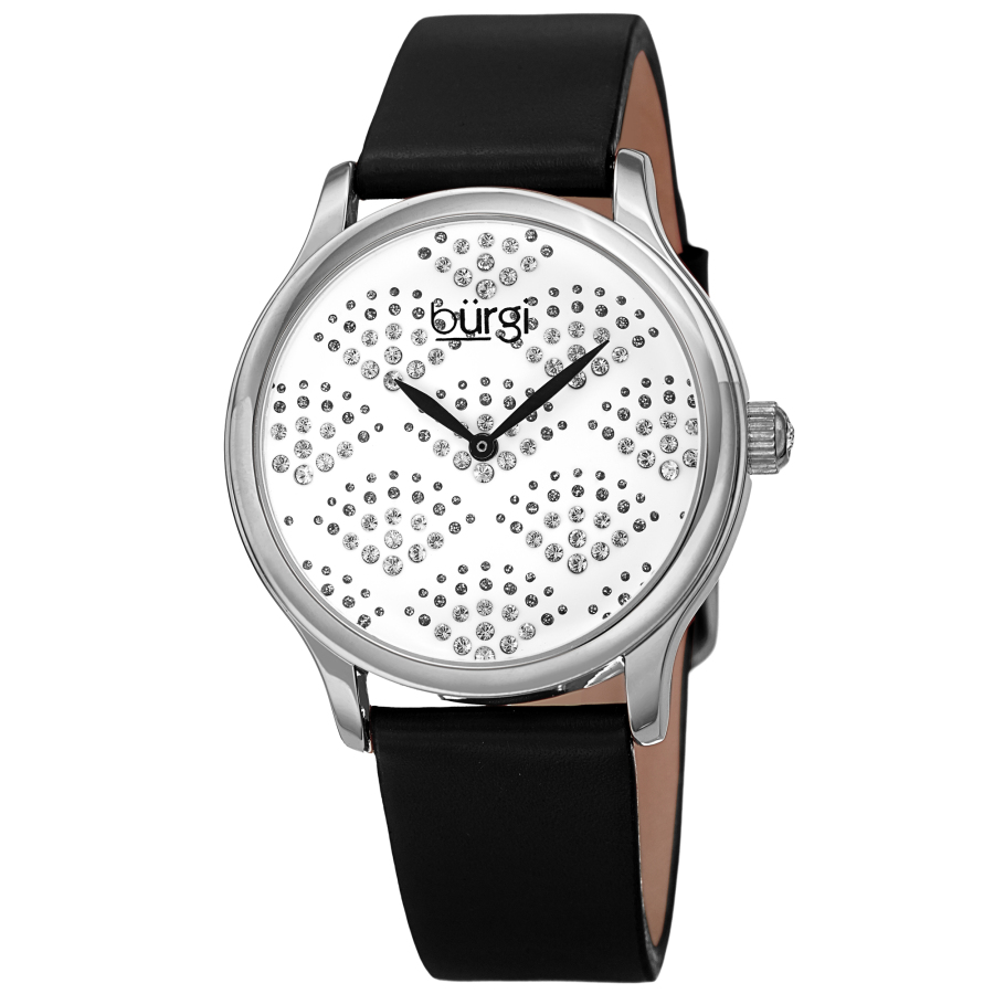 Silver-tone composite metal case with a black leather strap. Fixed silver-tone composite metal bezel. White (fan pattern) (Swarovski crystal-set) dial with black leaf-style hands. No markers. Dial Type: Analog. Quartz movement. Scratch resistant mineral crystal. Pull / push crown. Solid case back. Round case shape. Case size: 36 mm. Case thickness: 10.3 mm. Band width: 18 mm. Band length: 7.5 inches. Tang clasp. Water resistant at 30 meters / 100 feet. Functions: hour, minute. Pebble Style Series. Fashion watch style. Burgi Pebble Style Quartz White Dial Ladies Watch BUR238SSB.