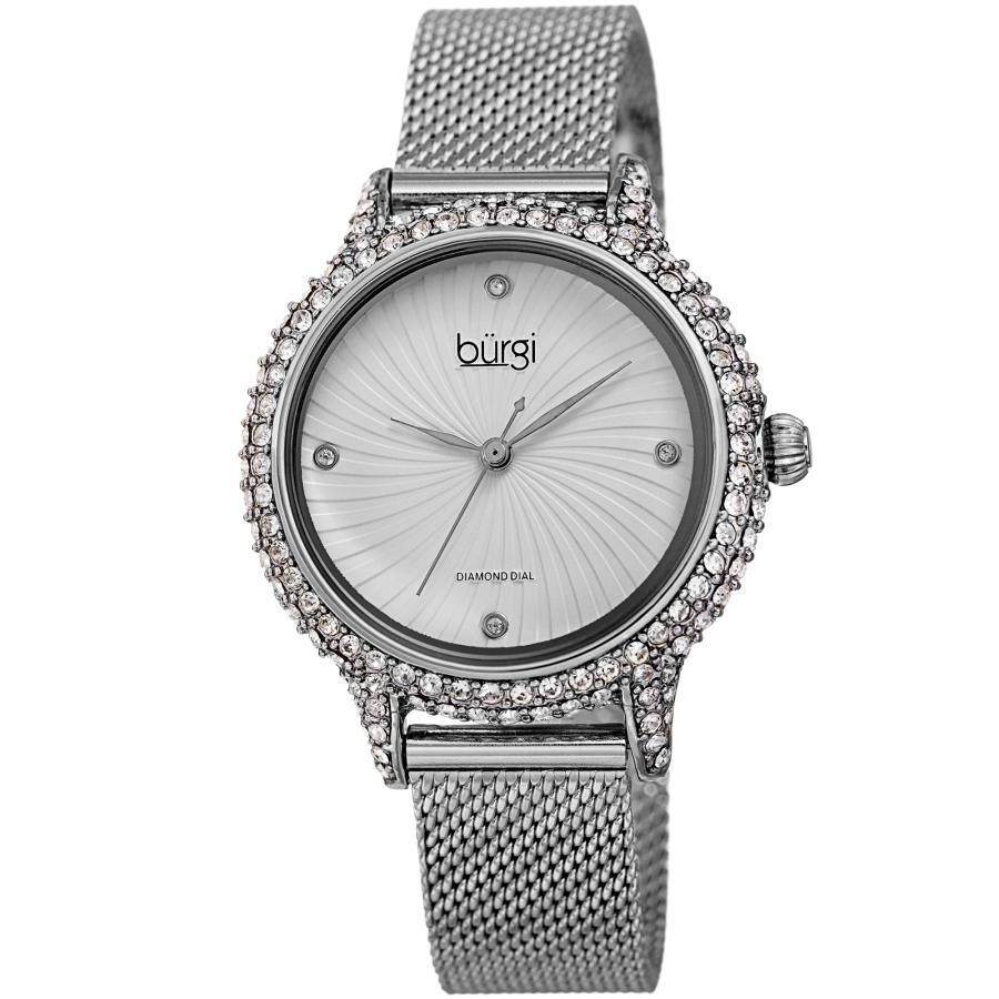 Silver-tone alloy case set (all over) with Swarovski crystals with a stainless steel mesh bracelet. Fixed silver-tone alloy bezel set with Swarovski crystals. Silver dial with silver-tone leaf-style hands. Diamonds mark the 3, 6, 9 and 12 o'clock positions. Dial Type: Analog. Quartz movement. Scratch resistant mineral crystal. Pull / push crown. Solid case back. Round case shape. Case size: 34 mm. Case thickness: 7 mm. Band width: 14 mm. Band length: 8.5 inches. Fold over slip through clasp. Water resistant at 30 meters / 100 feet. Functions: hour, minute, second. Fashion watch style. Burgi Quartz Diamond Silver Dial Ladies Watch BUR250SS.
