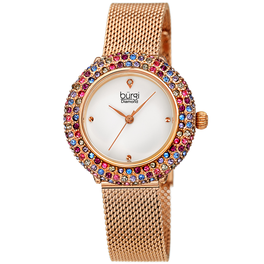 Rose gold-tone brass case with a rose gold-tone stainless steel bracelet. Fixed rose gold-tone bezel. Silver-tone dial with rose gold-tone hands and diamond hour markers. Dial Type: Analog. Quartz movement. Scratch resistant hardlex crystal. Pull / push crown. Solid case back. Round case shape, case size: 33 mm, case thickness: 7.5 mm. Band width: 14 mm, band length: 8 inches. Water resistant at 30 meters / 100 feet. Functions: hour, minute. Fashion watch style. Burgi Quartz Diamond Silver Dial Ladies Watch BUR258RGPU.