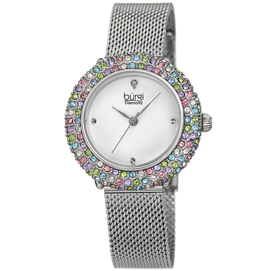 Silver-tone brass case with a silver-tone stainless steel bracelet. Fixed silver-tone bezel. Silver-tone dial with silver-tone hands and diamond hour markers. Dial Type: Analog. Quartz movement. Scratch resistant hardlex crystal. Pull / push crown. Solid case back. Round case shape, case size: 33 mm, case thickness: 7.5 mm. Band width: 14 mm, band length: 8 inches. Water resistant at 30 meters / 100 feet. Functions: hour, minute, second. Fashion watch style. Burgi Quartz Diamond Silver Dial Ladies Watch BUR258SS.