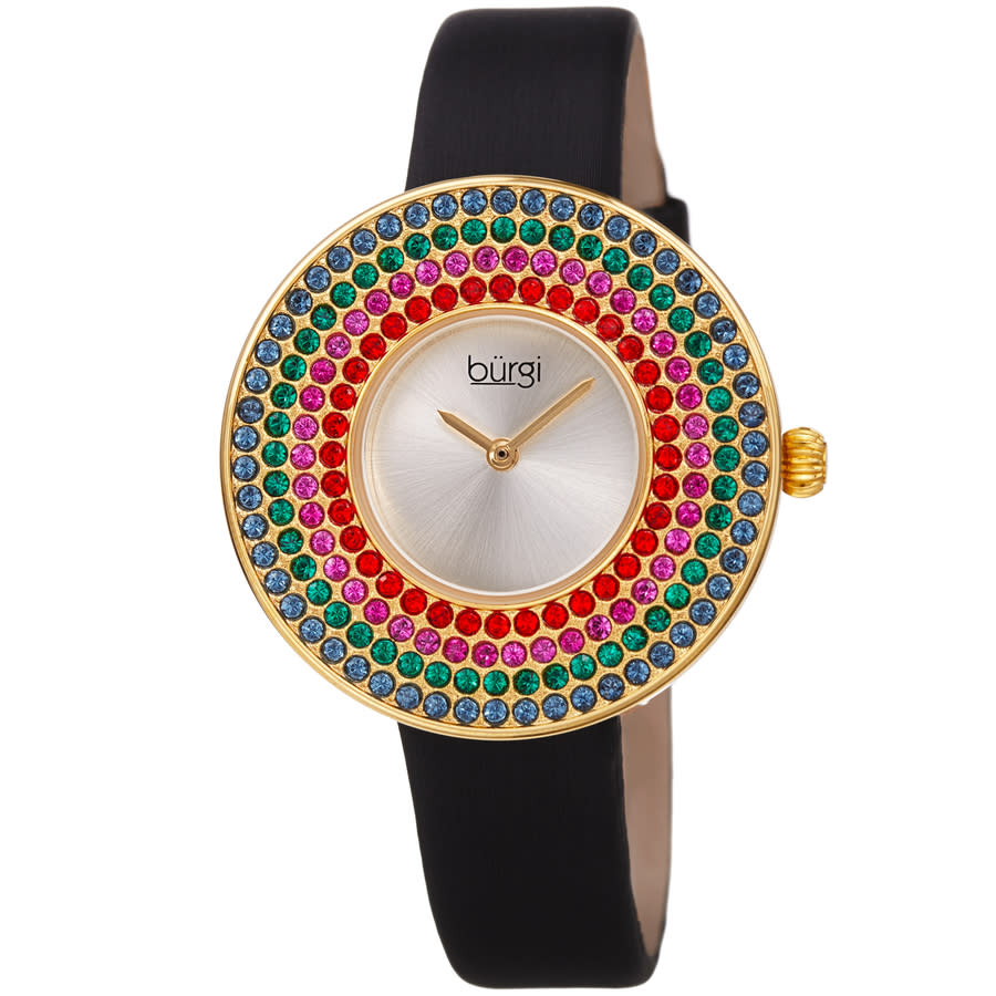 Gold-tone brass case with a black satin (leather backed) strap. Fixed gold-tone brass set with swarovski crystals bezel. Silver dial with gold-tone pencil-style shape hands. Dial Type: Analog. Quartz movement. Scratch resistant Hardlex crystal. Pull / push crown. Solid case back. Round case shape, case size: 36 mm, case thickness: 8 mm. Band width: 14 mm. Tang clasp. Water resistant at 30 meters / 100 feet. Functions: hour, minute. Dress watch style. Burgi Quartz Silver Dial Black Satin Ladies Watch BUR270YG.