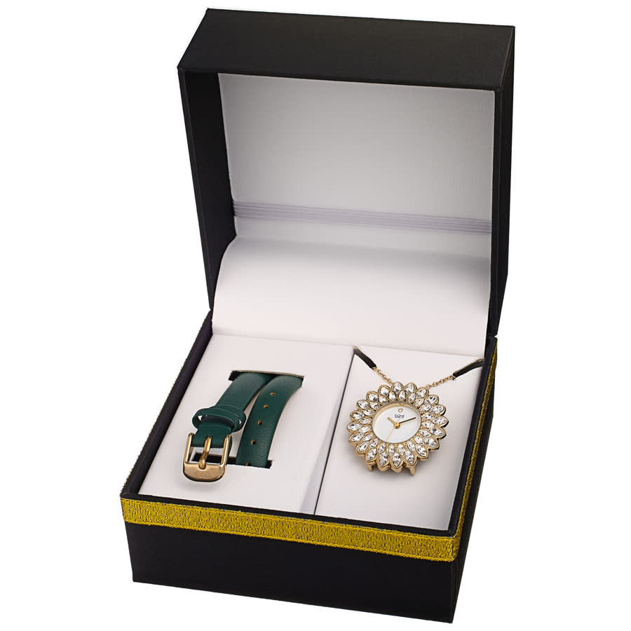 Gold-tone composite case with a green leather strap. Fixed gold-tone stainless steel bezel. White dial with gold-tone hands and diamond hour markers. Dial Type: Analog. Quartz movement. Scratch resistant hardlex crystal. Pull / push crown. Round case shape. Case size: 32 mm. Buckle clasp. Water resistant at 30 meters / 100 feet. Functions: hour, minute, second. Dress watch style. Burgi Quartz Diamond White Dial Ladies Watch BUR273GN.
