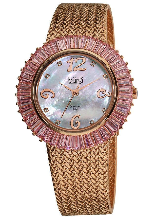 Rose gold-tone brass case with a rose gold-tone brass mesh bracelet. Fixed rose gold-tone pink baguette crysta bezel. Mother of pearl dial with rose-tone hands and diamond hour markers. Arabic numerals mark the 3, 6, 9 and 12 o'clock positions. Dial Type: Analog. Quartz movement. Scratch resistant mineral crystal. Pull / push crown. Snap down case back. Round case shape, case size: 36 mm, case thickness: 8.5 mm. Band width: 19 mm, band length: 7.5 inches. Sliding clasp. Water resistant at 10 meters / 33 feet. Functions: hour, minute, second. Additional Info: eight genuine diamond hour markers, cz stones. Faceted Crystal Bezel Series. Dress watch style. Burgi Faceted Crystal Bezel Mother of Pearl Dial Ladies Watch BUR076PK.