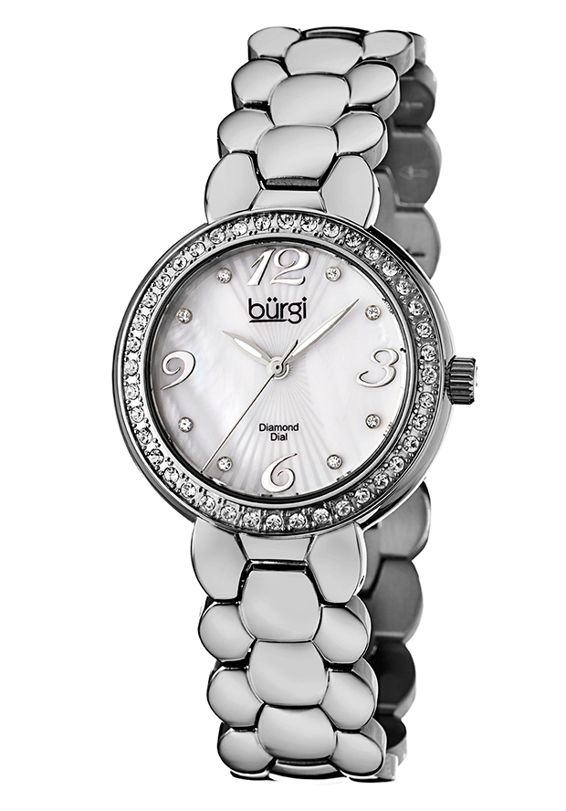 Stainless steel case with a stainless steel bracelet. Fixed stainless steel bezel set with crystals. White mother of pearl dial with luminous silver-tone hands and diamond hour markers. Arabic numerals mark the 3, 6, 9 and 12 o'clock positions. Dial Type: Analog. Luminescent hands. Swiss quartz movement. Scratch resistant mineral crystal with sapphire coating. Pull / push crown. Screw down case back. Case diameter: 35 mm. Case thickness: 9.5 mm. Round case shape. Band width: 18 mm. Band length: 8.5 inches. Jewelry clasp. Water resistant at 30 meters/99 feet. Functions: hour, minute, second. Additional Info: genuine diamonds on dial. Dress watch style. Burgi White Mother of Pearl Dial Stainless Steel Bracelet Ladies Watch BUR084SS.