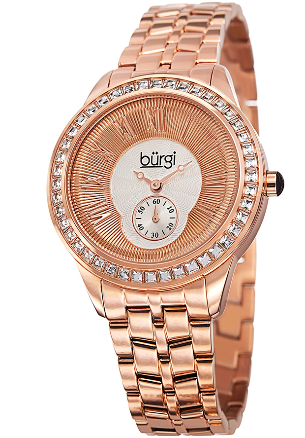 Rose gold-tone stainless steel case and bracelet. Fixed rose gold-tone bezel set with baguette crystals. Rose (silver center) dial with rose gold-tone hands and Roman numeral hour markers. Dial Type: Analog. Small seconds above the 6 o'clock positions subdials. Quartz movement. Scratch resistant mineral crystal. Pull / push crown. Screw down case back. Round case shape. Case size: 38 mm. Case thickness: 9 mm. Band width: 18 mm. Band length: 7.5 inches. Jewelry clasp. Water resistant at 30 meters / 100 feet. Functions: hour, minute, second. Casual watch style. Watch label: Hong Kong. Burgi Silver and Gold Dial Rose Gold-tone Ladies Watch BUR106RG.