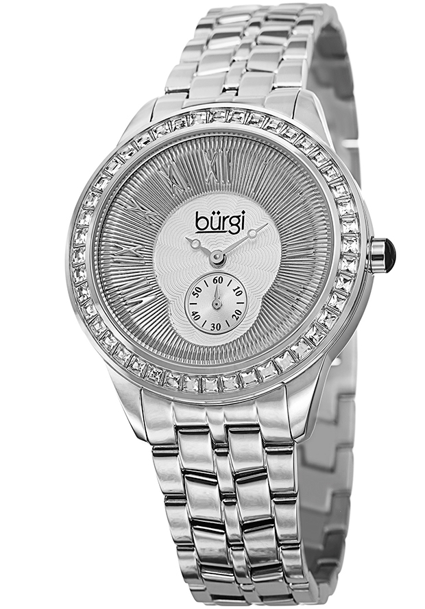 Silver-tone stainless steel case with a silver-tone stainless steel bracelet. Fixed silver-tone bezel set with baguette crystals. Silver dial with silver-tone hands and Roman numeral hour markers. Dial Type: Analog. Seconds sub-dial above the 6 o'clock positions. Quartz movement. Scratch resistant mineral crystal. Pull / push crown. Screw down case back. Case diameter: 38 mm. Round case shape. Band width: 18 mm. Band length: 7.5 inches. Jewelry clasp. Water resistant at 30 meters / 100 feet. Functions: hour, minute, second. Casual watch style. Watch label: Hong Kong. Burgi Silver Dial Stainless Steel Case Ladies Watch BUR106SS.