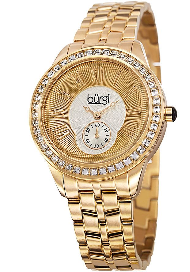 Gold-tone stainless steel case and bracelet. Fixed gold-tone bezel set with baguette crystals. Gold and silver dial with gold-tone hands and Roman numeral hour markers. Dial Type: Analog. Seconds sub-dial above the 6 o'clock positions. Quartz movement. Scratch resistant mineral crystal. Pull / push crown. Screw down case back. Case diameter: 38 mm. Round case shape. Band width: 18 mm. Band length: 7.5 inches. Jewelry clasp. Water resistant at 30 meters / 100 feet. Functions: hour, minute, second. Casual watch style. Watch label: Hong Kong. Burgi Silver and Gold Dial Gold-tone Steel Case Ladies Watch BUR106YG.