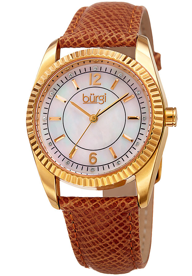 Gold tone alloy case with a brown leather strap. Fixed bezel. Mother of pearl dial with rose gold-tone hands and index-Arabic numerals hour markers. Dial Type: Analog. Japanese quartz movement. Scratch resistant mineral crystal. Pull / push crown. Solid case back. Case size: 36 mm. Case thickness: 11 mm. Round case shape. Tang clasp. Water resistant at 30 meters / 100 feet. Functions: hour, minute, second. Casual watch style. Burgi Mother Of Pearl Dial Ladies Leather Watch BUR167TN.