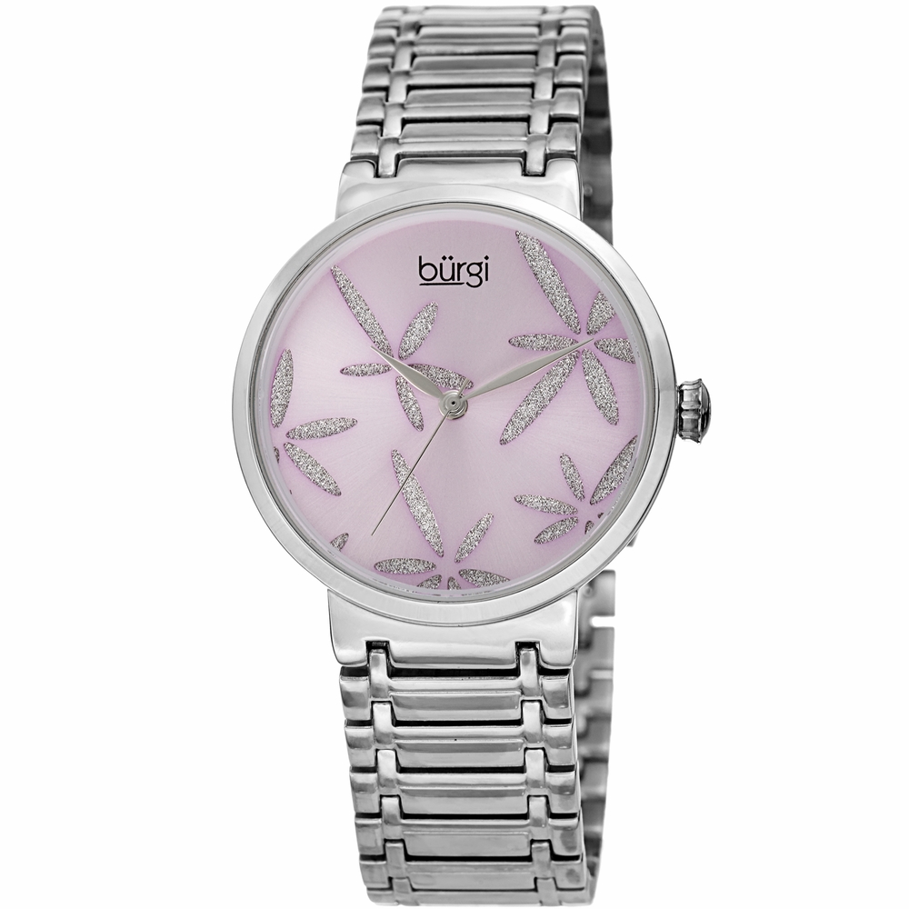 Silver-tone alloy case with a silver-tone stainless steel bracelet. Fixed silver-tone alloy bezel. Purple (glitter flower) dial with silver-tone hands. No markers. Dial Type: Analog. Quartz movement. Scratch resistant mineral crystal. Push/pull crown. Solid case back. Round case shape, case size: 34 mm, case thickness: 8.5 mm. Band width: 18 mm, band length: 7.25 inches. Fold over clasp. Water resistant at 30 meters / 100 feet. Functions: hour, minute, second. Sparkling Flower Series. Casual watch style. Burgi Sparkling Flower Quartz Ladies Watch BUR190SSPU.