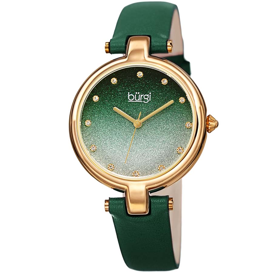 Rose gold-tone polished finish alloy case with a green leather strap. Fixed rose gold-tone polished alloy bezel. Green glitter dial with stick style hands and applied swarovski stone dots hour markers. Dial Type: Analog. Quartz movement. Scratch resistant mineral crystal with hardened coating crystal. Push/pull fluted crown crown. Solid case back. Round case shape, case size: 34 mm, case thickness: 8 mm. Band width: 14 mm, band length: 7 inches. Tang buckle clasp. Water resistant at 30 meters / 100 feet. Functions: classic three hand movement. Dress watch style. Burgi Ladies Glitter Ombre Swarovski Crystal Dial Genuine Leather Strap Watch.