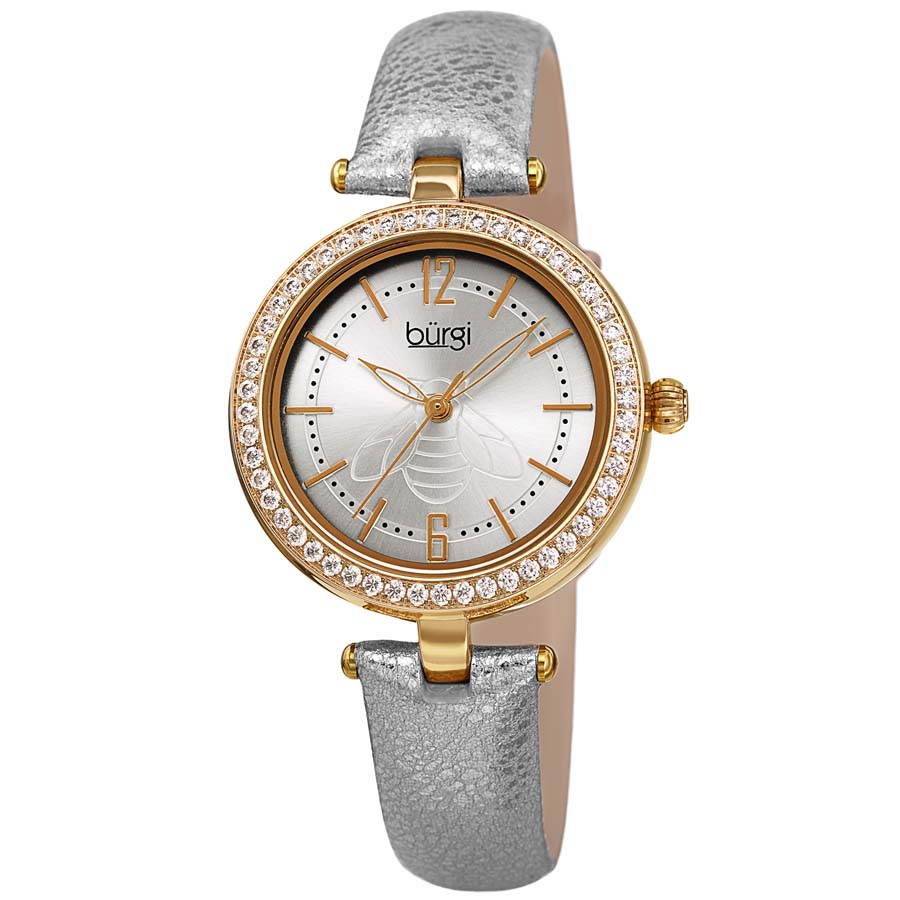 Gold-tone alloy case with a genuine leather strap. Fixed gold-tone stainless steel bezel. Silver dial with skeleton leaf hands and Arabic numeral and index hour markers. Minute markers around the outer rim. Dial Type: Analog. Quartz movement. Scratch resistant mineral crystal. Push/pull crown. Solid case back. Round case shape, case size: 34 mm, case thickness: 7.8 mm. Band width: 14 mm, band length: 7.5 inches. Buckle clasp. Water resistant at 30 meters / 100 feet. Functions: hour, minute, second. Casual watch style. Burgi Crystal Silver Dial Ladies Watch BUR235YG.