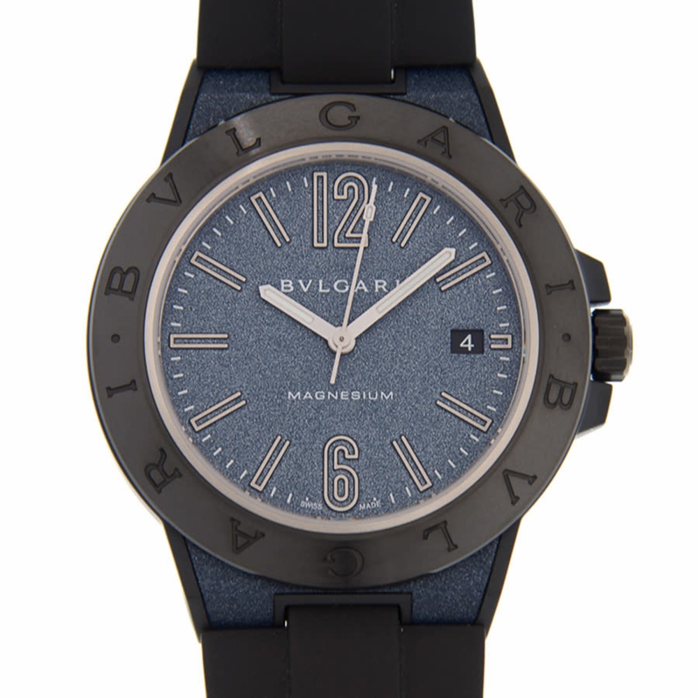 Black ceramic case with a black rubber strap. Fixed black ceramic bezel. Black dial with silver-tone hands and index hour markers. Minute markers around the outer rim. Dial Type: Analog. Luminescent hands. Date display at the 3 o'clock position. Bvlgari Calibre BVL 191 Solotempo Automatic movement, containing 26 Jewels, bitting at 28800 vph, and has a power reserve of approximately 42 hours. Scratch resistant sapphire crystal. Solid case back. Round case shape, case size: 41 mm. Buckle clasp. Functions: date, hour, minute, second. Additional Info: original box, international warranty card, manual (complete accessories). Diagono Series. Luxury watch style. Watch label: Swiss Made. Bvlgari Diagono Automatic Black Dial Mens Watch DG41C3SMCVD.