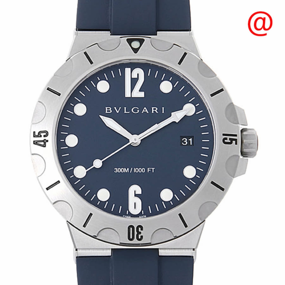 Silver-tone stainless steel case with a blue rubber strap. Fixed silver-tone stainless steel bezel. Blue dial with silver-tone hands and Arabic numeral at the 12 & 6 o'clock, dots hour markers. Minute markers around the outer rim. Dial Type: Analog. Luminescent hands and markers. Date display at the 3 o'clock position. Bvlgari Calibre BVL 191 Solotempo Automatic movement, containing 26 Jewels, bitting at 28800 vph, and has a power reserve of approximately 42 hours. Anti-reflective scratch resistant sapphire crystal. Screw down crown. Solid case back. Round case shape, case size: 41 mm. Tang buckle clasp. Water resistant at 300 meters / 1000 feet. Functions: date, hour, minute, second. Diagono Scuba Series. Luxury watch style. Watch label: Swiss Made. Item Variations: DP41C3SVSD. Bvlgari Diagono Scuba Automatic Blue Dial Mens Watch 102504.