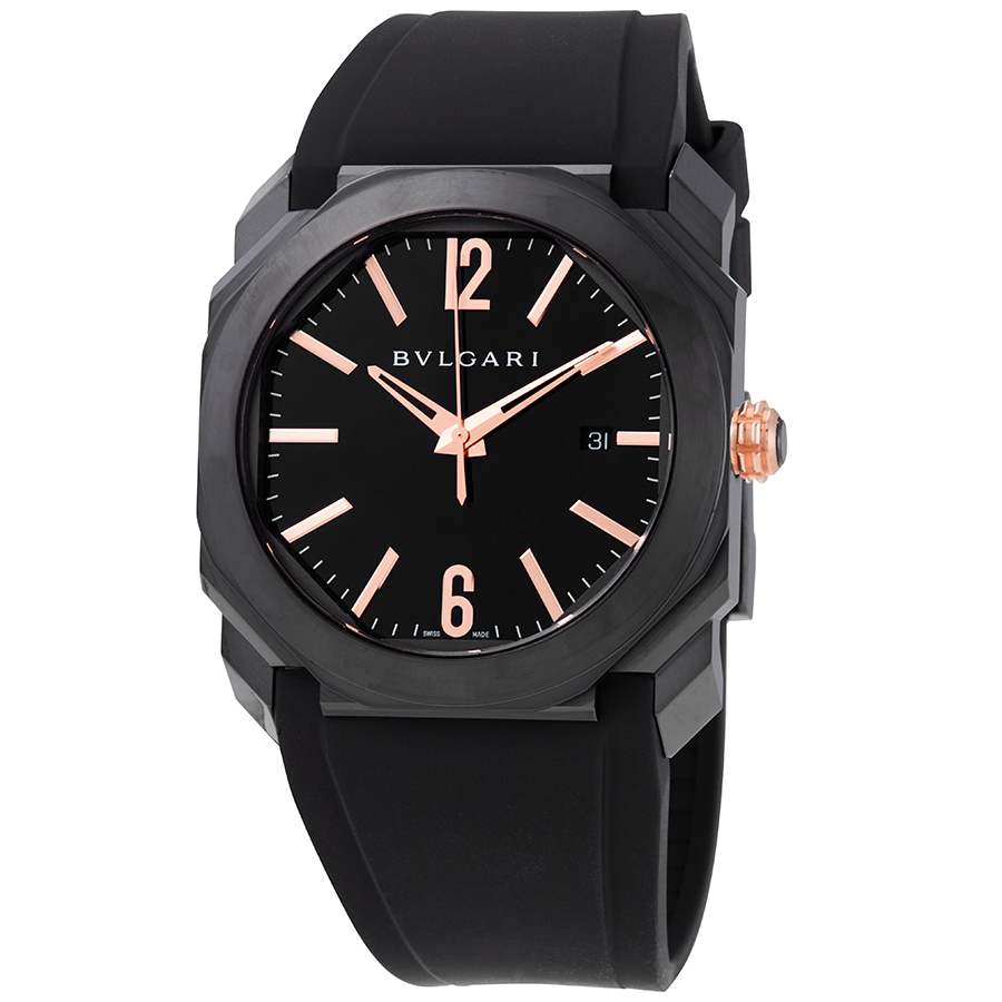 Black dlc stainless steel case with a black integrated rubber strap. Fixed black stainless steel bezel. Black dial with 18 kt rose gold hands and Arabic numeral and index hour markers. Dial Type: Analog. Date display at the 3 o'clock position. Bvlgari Calibre BVL 193 Automatic movement, containing 28 Jewels, bitting at 28800 vph, and has a power reserve of approximately 50 hours. Scratch resistant sapphire crystal. Transparent case back. Octagon case shape, case size: 41 mm. Pin buckle clasp. Water resistant at 100 meters / 330 feet. Functions: date, hour, minute, second. Octo Series. Luxury watch style. Watch label: Swiss Made. Item Variations: BGO41BBSVD. Bvlgari Octo Automatic Black Dial Mens Watch 102581.