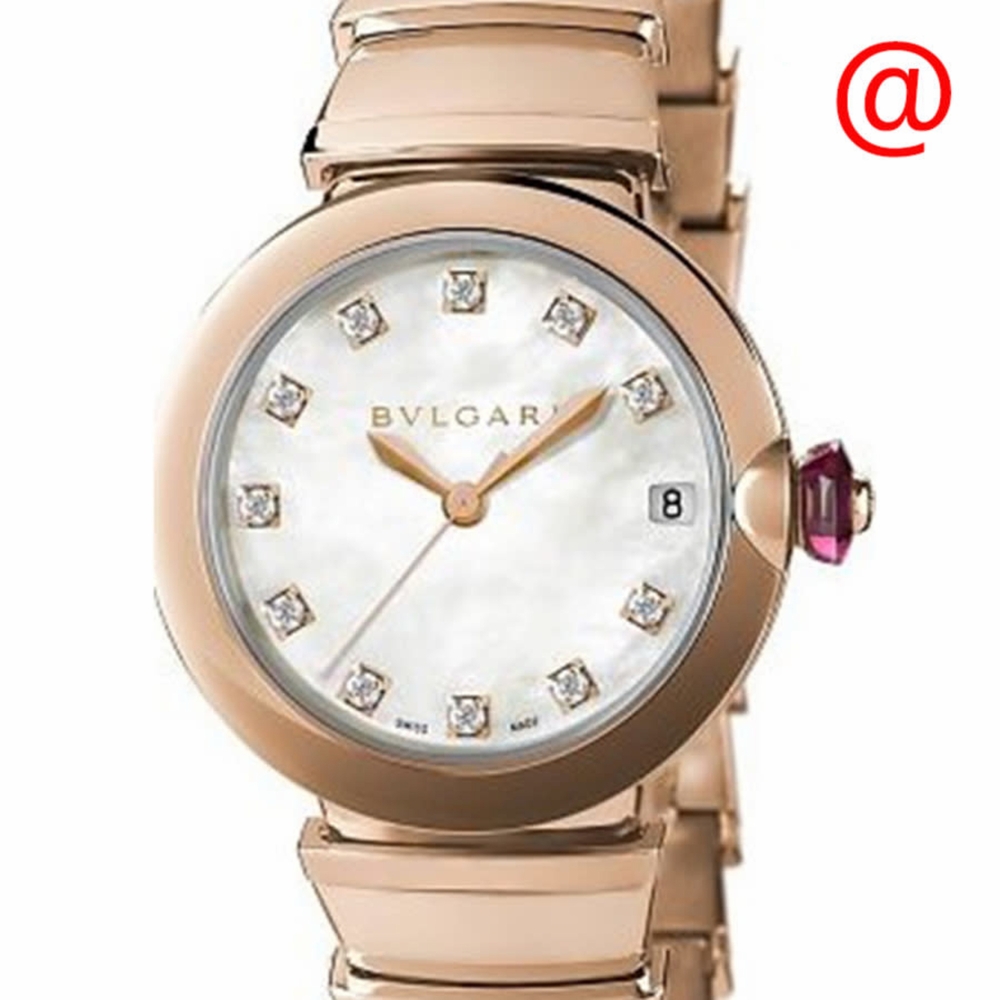 18k pink gold case with a 18k pink gold bracelet. Fixed bezel. White mother-of-pearl dial with diamond hour markers. Dial Type: Analog. Date display at the 3 o'clock position. Automatic movement. Scratch resistant sapphire crystal. Pull / push crown. Skeleton transparent exhibition see through case back. Case diameter: 33 mm. Round case shape. Deployment with push button clasp. Water resistant at 50 meters / 165 feet. Functions: date, hour, minute, second. Luxury watch style. Watch label: Swiss Made. Item Variations: LUP33WGGD/11. Bvlgari LVCEA White Mother-of-Pearl Diamond Dial Automatic Ladies Watch 102353.