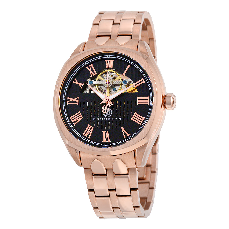 Rose gold-tone stainless steel case and bracelet. Fixed rose gold-tone bezel. Black (skeletal display) dial with luminous rose gold-tone dauphine-style hands and Roman numeral hour markers. Minute markers around the outer rim. Dial Type: Analog. Luminescent hands and markers. Calibre PTS-LTTR001 automatic movement with a 36-hour power reserve. Scratch resistant sapphire coated crystal. Pull / push crown. Skeleton case back with the Brooklyn Bridge etching. Cushion case shape. Case size: 46 mm. Case thickness: 13.6 mm. Band width: 22 mm / 20 mm, band length: 8 inches. Deployment clasp with a push button release. Water resistant at 50 meters / 165 feet. Functions: hour, minute, second. Additional Info: three hand jewels : 20 - v.p.h : 21600. Dress watch style. Watch label: Far East. Item Variations: SOT 63895, SOT.63895, SOT63895. Brooklyn Dunham Skeleton Automatic Black Dial Mens Watch 202-M3262.