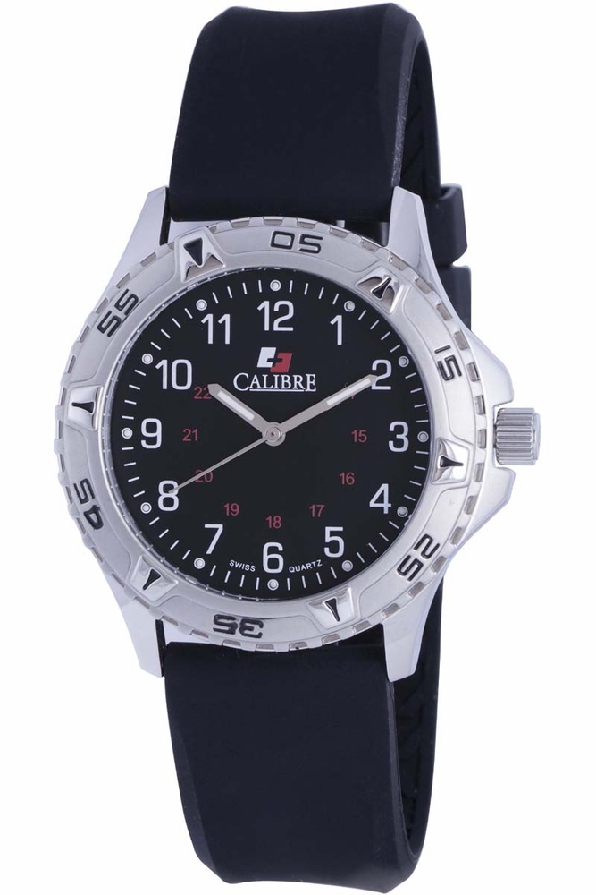 Silver-tone stainless steel case with a black silicone strap. Unidirectional silver-tone stainless steel bezel. Black dial with silver-tone hands and Arabic numeral hour markers. Minute markers around the outer rim. Dial Type: Analog. Luminescent hands. Quartz movement. Scratch resistant mineral crystal. Case size: 42 mm. Case thickness: 11 mm. Round case shape. Band width: 21.5 mm. Band length: 8.5 inches. Buckle clasp. Water resistant at 50 meters / 165 feet. Functions: hour, minute, second. Sport watch style. Calibre Sea Wolf Black Dial Mens Watch SC-4S1-04-007R.