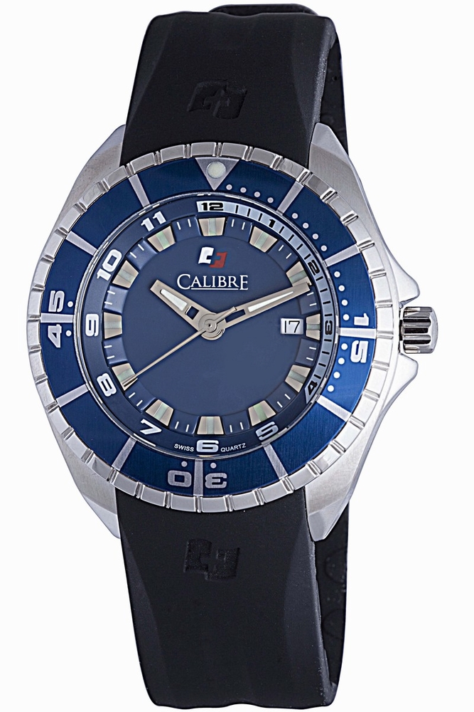 Stainless steel case with a black rubber strap. Fixed bezel. Blue dial with silver-toned hands and index hour markers. Minute markers around the outer rim. Dial Type: Analog. Date display at the 3 o'clock position. Quartz movement. Scratch resistant mineral crystal. Case diameter: 44 mm. Case thickness: 14 mm. Round case shape. Band width: 22 mm. Tang clasp. Water resistant at 100 meters / 330 feet. Functions: date, hour, minute, second. Casual watch style. Calibre Sea Knight Blue Dial Black Rubber Strap Mens Watch SC-4S2-04-001-3.