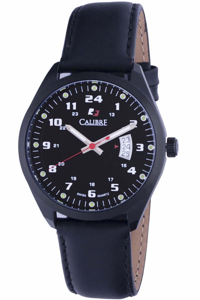 Black IP stainless steel case with a black leather calfskin strap. Fixed bezel. Black dial with silver-toned hands and Arabic hour markers. Minute markers around the outer rim. Dial Type: Analog. Date display at the 3 o'clock position. Quartz movement. Scratch resistant mineral crystal. Case diameter: 40 mm. Case thickness: 9.5 mm. Round case shape. Band width: 19.5 mm. Tang clasp. Water resistant at 50 meters / 165 feet. Functions: date, hour, minute, second. Casual watch style. Calibre Trooper Black Dial Black Leather Mens Watch SC-4T1-13-007.