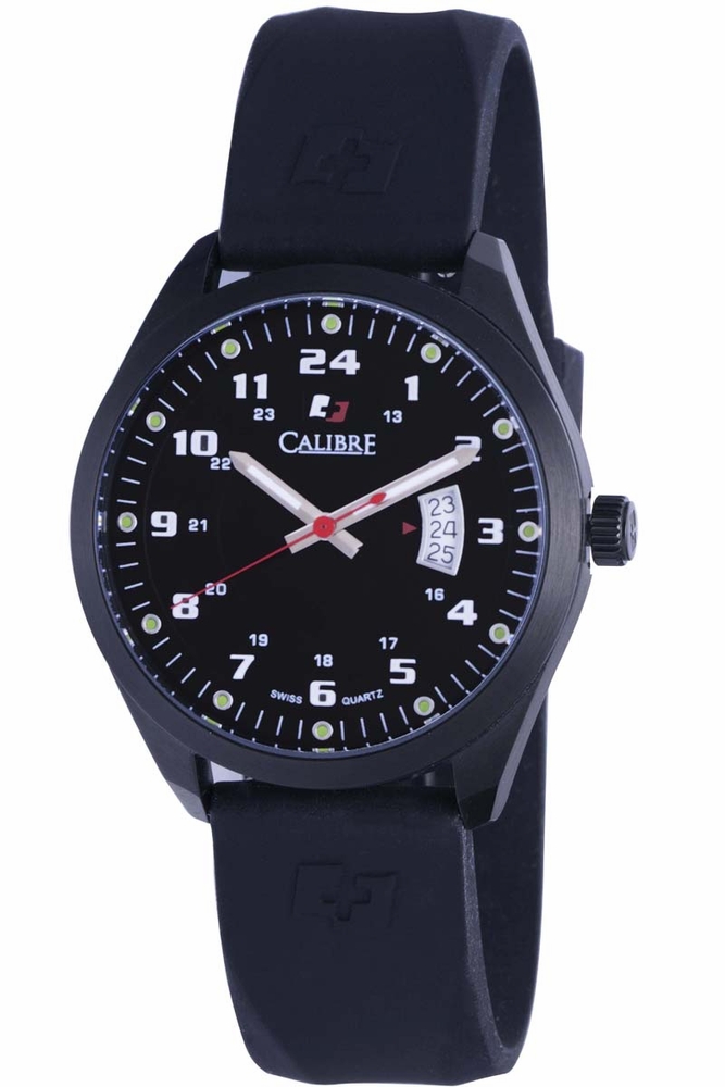 Stainless steel case with a black rubber strap. Fixed bezel. Black dial with silver-toned hands and Arabic hour markers. Minute markers around the outer rim. Dial Type: Analog. Date display at the 3 o'clock position. Quartz movement. Scratch resistant mineral crystal. Case diameter: 40 mm. Case thickness: 9.5 mm. Round case shape. Band width: 19 mm. Tang clasp. Water resistant at 50 meters / 165 feet. Functions: date, hour, minute, second. Casual watch style. Calibre Trooper Black DIal Black Rubber Mens Watch SC-4T1-13-007R.