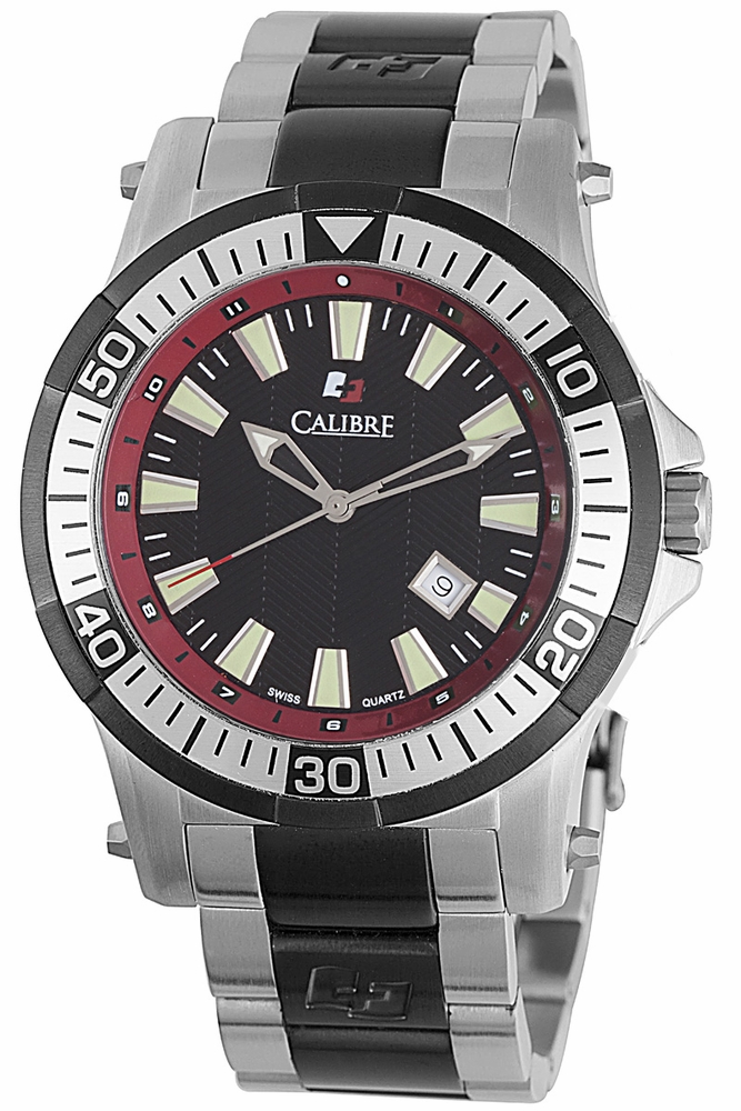 Stainless steel case with a silver stainless steel bracelet. Fixed bezel. Black and red dial with skeleton hands and index hour markers. Minute markers around the outer rim. Dial Type: Analog. Date display at the 4 o'clock position. Quartz movement. Scratch resistant mineral crystal. Round case shape. Fold over clasp with double push button safety clasp. Water resistant at 100 meters / 330 feet. Functions: date, hour, minute, second. Sport watch style. Calibre Hawk Date Black and Red Dial Stainless Steel Mens Watch SC-5H1-04-007-4.