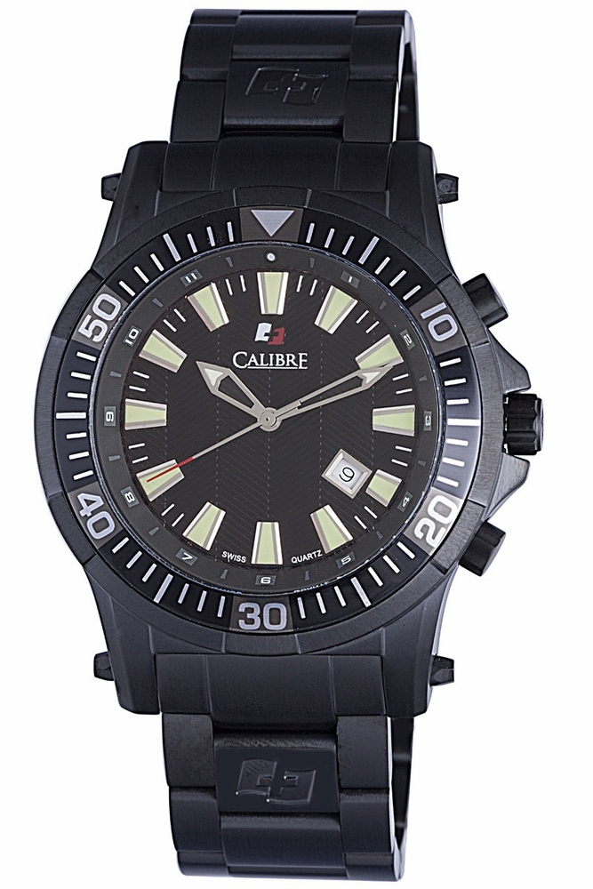 Black PVD stainless steel case with a black PVD stainless steel bracelet. Fixed black stainless steel bezel. Black dial with skeleton hands and index hour markers. Minute markers around the outer rim. Dial Type: Analog. Luminescent hands and markers. Date display at the 4 o'clock position. Quartz movement. Scratch resistant mineral crystal. Solid case back. Round case shape, case size: 45 mm, case thickness: 11 mm. Band width: 22 mm. Fold over with double push button safety clasp. Water resistant at 100 meters / 330 feet. Functions: date, hour, minute, second. Sport watch style. Watch label: Swiss Movt. Item Variations: SC 5H1 13 007, SC.5H1.13.007, SC5H113007. Calibre Hawk Date Black Dial Black PVD Stainless Steel Mens Watch SC-5H1-13-007.
