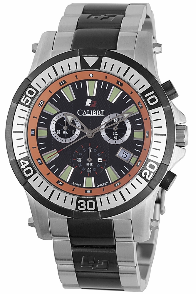 Silver-tone stainless steel case with a silver and black stainless steel bracelet. Fixed bezel. Black dial with rose gold-tone hands and index hour markers. Minute markers around the outer rim. Dial Type: Analog. Luminescent hands and markers. Date display at the 4 o'clock position. Chronograph - three sub-dials displaying: 60 second, 30 minute and 12 hours. Quartz movement. Scratch resistant mineral crystal. Case size: 45 mm. Case thickness: 11 mm. Round case shape. Band width: 22 mm. Band length: 8.5 inches. Fold over with double push button safety clasp. Water resistant at 100 meters / 330 feet. Functions: chronograph, date, hour, minute, second. Casual watch style. Calibre Hawk Chronograph Mens Watch SC-5H2-04-007.079.