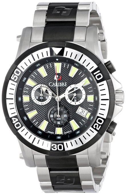Silver-tone stainless steel case with a two-tone (black and silver-tone) stainless steel bracelet. Fixed two-tone (black and white) stainless steel bezel. Black dial with skeleton hands and index hour markers. Minute markers around the outer rim. Dial Type: Analog. Luminescent hands and markers. Date display at the 4 o'clock position. Chronograph - three sub-dials displaying: 60 second, 30 minute and 12 hour. Quartz movement. Scratch resistant mineral crystal. Solid case back. Round case shape, case size: 45 mm, case thickness: 11 mm. Band width: 22 mm. Fold over with double push button safety clasp. Water resistant at 100 meters / 330 feet. Functions: chronograph, date, hour, minute, second. Sport watch style. Watch label: Swiss Movt. Item Variations: SC 5H2 04 007, SC.5H2.04.007, SC5H204007. Calibre Hawk Date Black Dial Chronograph Stainless Steel Mens Watch SC-5H2-04-007.