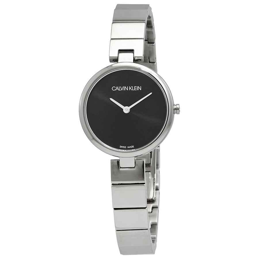 Stainless steel case with a stainless steel bracelet. Fixed stainless steel bezel. Black dial with silver-tone hands. No markers. Dial Type: Analog. Quartz movement. Scratch resistant mineral crystal. Pull / push crown. Solid case back. Round case shape. Case size: 28 mm. Case thickness: 6 mm. Band width: 10 mm. Fold over clasp with a safety release. Water resistant at 30 meters / 100 feet. Functions: hour, minute. Casual watch style. Watch label: Swiss Made. Calvin Klein Authentic Quartz Black Dial Ladies Watch K8G23141.