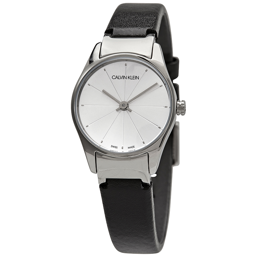 Stainless steel case with a black leather strap. Fixed stainless steel bezel. Silver-tone dial with silver-tone hands and index hour markers. Dial Type: Analog. Quartz movement. Scratch resistant mineral crystal. Pull / push crown. Solid case back. Round case shape. Case size: 24 mm. Case thickness: 7.25 mm. Band width: 12 mm. Tang clasp. Water resistant at 30 meters / 100 feet. Functions: hour, minute. Casual watch style. Watch label: Swiss Made. Calvin Klein Classic Quartz Silver Dial Ladies Watch K4D231C6.