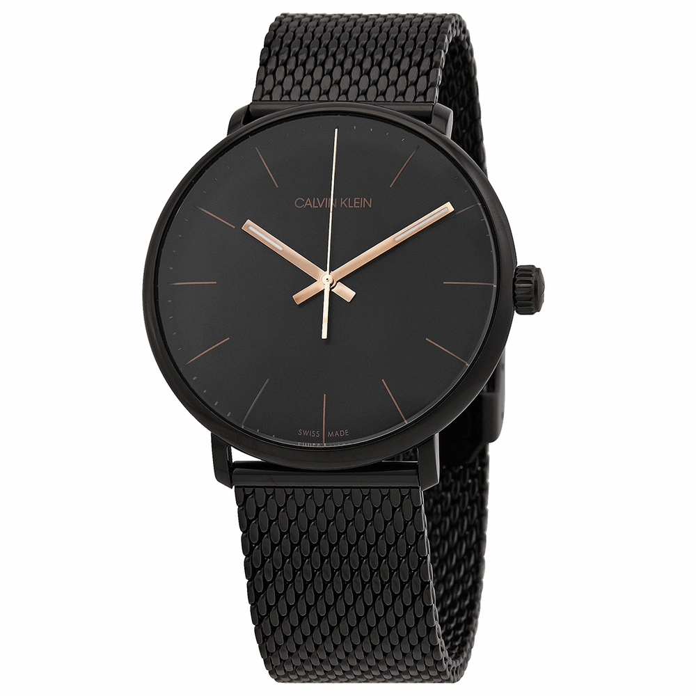 Black PVD stainless steel case with a black PVD stainless steel mesh bracelet. Fixed black PVD bezel. Black dial with luminousrose gold-tone hands and index hour markers. Minute markers around the outer rim. Dial Type: Analog. Luminescent hands. Quartz movement. Scratch resistant mineral crystal. Pull / push crown. Solid case back. Round case shape. Case size: 43 mm. Case thickness: 8.72 mm. Band width: 20 mm. Fold over slip through clasp. Water resistant at 30 meters / 100 feet. Functions: hour, minute, second. High Noon Series. Casual watch style. Watch label: Swiss Made. Calvin Klein High Noon Quartz Black Dial Mens Watch K8M21421.