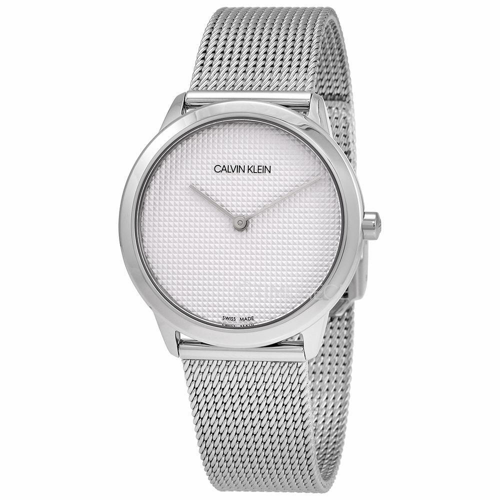 Stainless steel case with a stainless steel mesh bracelet. Fixed stainless steel bezel. White dial with silver-tone hands. No markers. Dial Type: Analog. Quartz movement. Scratch resistant mineral crystal. Pull / push crown. Solid case back. Round case shape. Case size: 35 mm. Case thickness: 6 mm. Band width: 18 mm. Fold over slip through clasp. Water resistant at 30 meters / 100 feet. Functions: hour, minute. Minimal Series. Casual watch style. Watch label: Swiss Made. Calvin Klein Minimal Quartz White Dial Ladies Watch K3M2212Y.