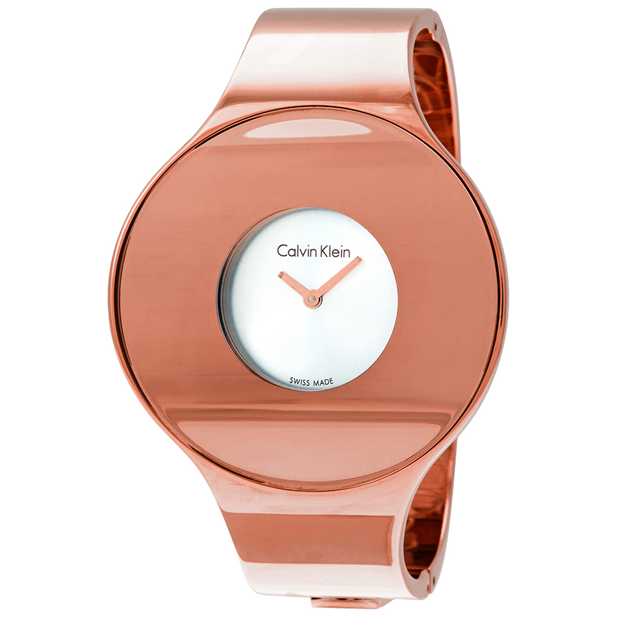 Rose gold PVD stainless steel case and bracelet. Fixed rose gold PVD bezel. Silver dial with rose gold-tone hands. No markers. Dial Type: Analog. Quartz movement. Scratch resistant mineral crystal. Pull / push crown. Solid case back. Round case shape. Case size: 38 mm. Case thickness: 9 mm. Jewelry clasp. Water resistant at 30 meters / 100 feet. Functions: hour, minute. Casual watch style. Watch label: Swiss Made. Calvin Klein Seamless Silver Dial Ladies Small Rose Gold-tone Bangle Watch K8C2S616.