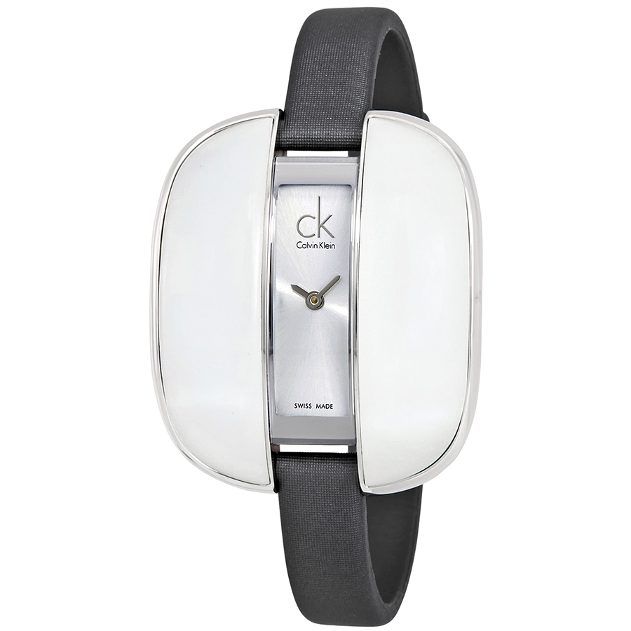 Stainless steel case with a black satin (leather backed) strap. Fixed stainless steel bezel. Silver dial with silver-tone hands. No markers. Dial Type: Analog. Quartz movement. Scratch resistant mineral crystal. Recessed pull / push crown. Solid case back. Unique case shape. Case size: 35 mm. Case thickness: 9 mm. Band width: 9 mm. Band length: 9.5 inches. Tang clasp. Water resistant at 30 meters / 100 feet. Functions: hour, minute. Dress watch style. Watch label: Swiss Made. Calvin Klein Treasure Silver Dial Ladies Watch K2E23626.