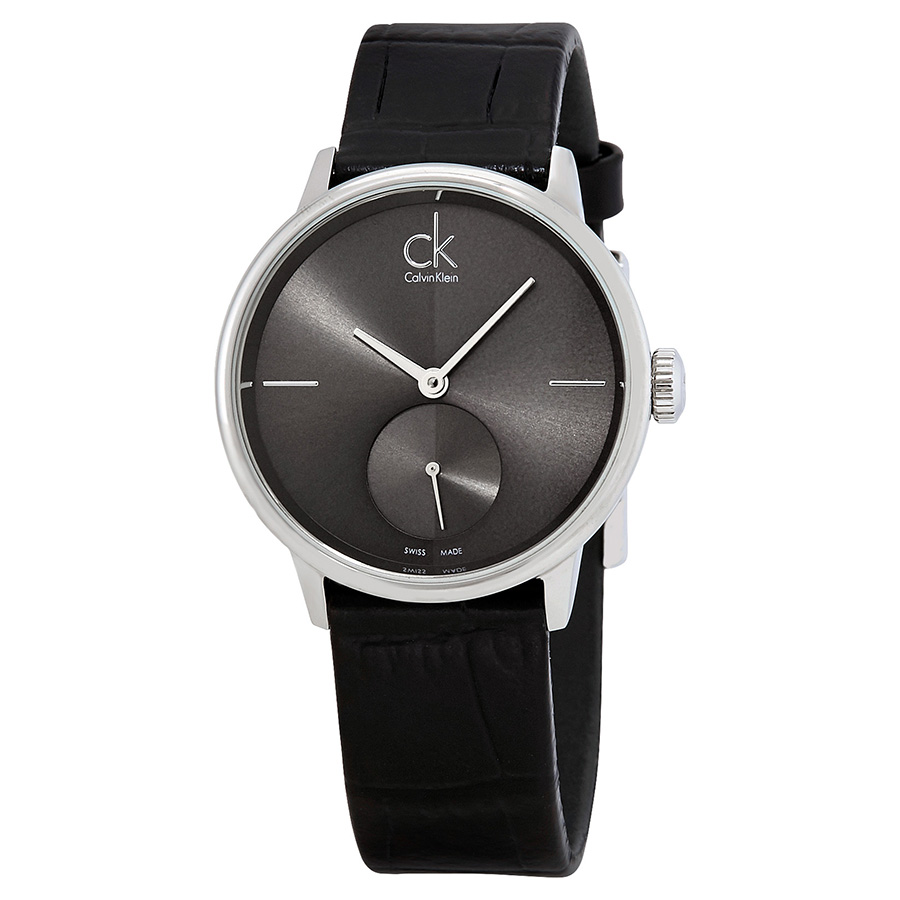 Stainless steel case with a black leather strap. Fixed stainless steel bezel. Black dial with silver-tone hands. Index markers at the 3 and 9 o'clopck positions. Dial Type: Analog. Seconds sub-dial. Quartz movement. Scratch resistant mineral crystal. Pull / push crown. Solid case back. Round case shape. Case size: 32 mm. Case thickness: 8 mm. Band width: 16 mm. Tang clasp. Water resistant at 30 meters / 100 feet. Functions: hour, minute, small second. Dress watch style. Watch label: Swiss Made. Calvin Klein Accent Black Dial Black Leather Ladies Watch K2Y231C3.