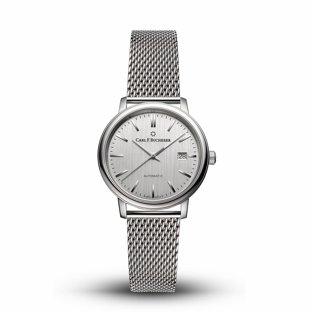 Silver-tone stainless steel case with a silver-tone stainless steel mesh bracelet. Fixed silver-tone bezel. Silver dial with silver-tone hands and index hour markers. Dial Type: Analog. Date display at the 3 o'clock position. Carl F. Bucherer Calibre CFB 1963 automatic movement with a 38-hour power reserve. Scratch resistant sapphire crystal. Round case shape, case size: 31 mm. Folding clasp. Water resistant at 30 meters / 100 feet. Functions: date, hour, minute, second. Adamavi Series. Luxury watch style. Watch label: Swiss Made. Carl F. Bucherer Adamavi Automatic Silver Dial Ladies Watch 00.10320.08.13.21.