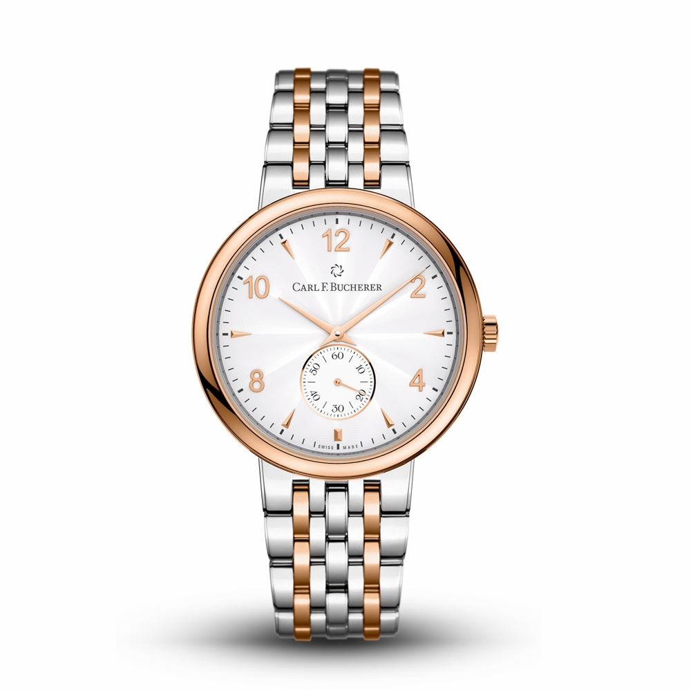 Two-tone (silver-tone and rose gold-tone) stainless steel/18k rose gold case and bracelet. 18k rose gold bezel. Mother of pearl dial with rose gold-tone hands and Arabic numeral/index hour markers. Dial Type: Analog. One subdial displaying: small second. Carl F. Bucherer Calibre CFB 1968 hand wind movement with a 42-hour power reserve. Scratch resistant sapphire crystal. Round case shape, case size: 39 mm. Folding clasp. Water resistant at 30 meters / 100 feet. Functions: hour, minute, small second. Adamavi Series. Luxury watch style. Watch label: Swiss Made. Carl F. Bucherer Adamavi Hand Wind Watch 00.10316.07.26.21.
