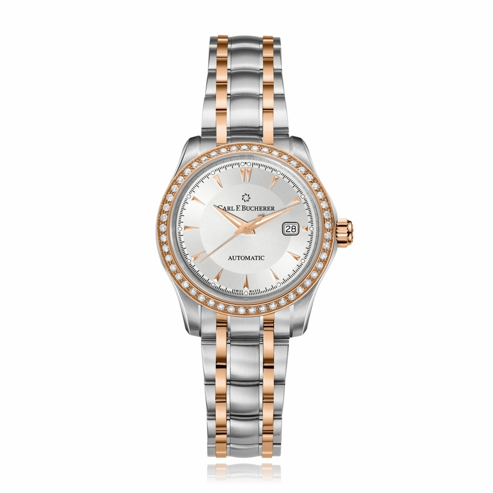 Two-tone (silver-tone and rose gold-tone) stainless steel/18k rose gold case and bracelet. Diamond set bezel. Silver dial with rose gold-tone hands and index hour markers. Dial Type: Analog. Luminescent hands. Date display at the 3 o'clock position. Carl F. Bucherer Calibre 2681 automatic movement. Scratch resistant sapphire crystal. Round case shape, case size: 30 mm. Folding clasp. Water resistant at 30 meters / 100 feet. Functions: date, hour, minute, second. Manero Autodate Series. Dress watch style. Watch label: Swiss Made. Carl F. Bucherer Manero AutoDate Automatic Diamond Silver Dial Ladies Watch 00.10911.07.13.31.