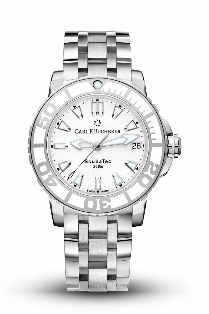 Stainless steel case with a stainless steel bracelet. Uni-directional rotating stainless steel bezel with a white ceramic inlay. White dial with luminous silver-tone hands and index hour markers. Minute markers around the outer rim. Dial Type: Analog. Luminescent hands and markers. Date display at the 3 o'clock position. Carl F. Bucherer calibre CFB 1950 automatic movement, containing 26 Jewels, bitting at 28800 vph, and has a power reserve of approximately 38 hours. Scratch resistant sapphire crystal. Screw down crown. Solid case back. Round case shape. Case size: 36.5 mm. Case thickness: 111.37 mm. Fold over clasp with a safety release. Water resistant at 200 meters / 660 feet. Functions: date, hour, minute, second. Patravi Scubatec Series. Luxury watch style. Watch label: Swiss Made. Carl F. Bucherer Patravi Scubatec Automatic White Dial Watch 00.10634.23.23.21.