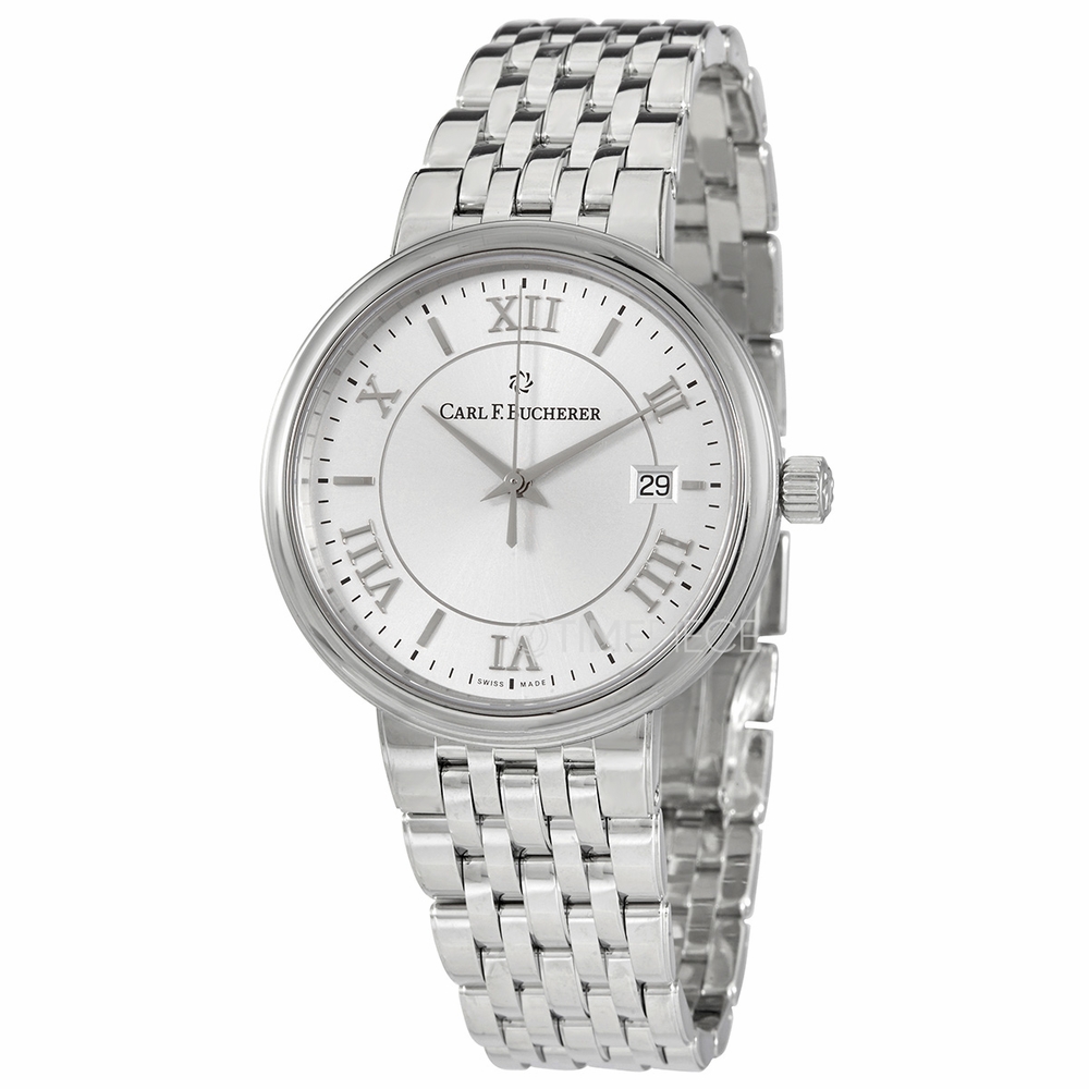 Stainless steel case with a stainless steel bracelet. Fixed stainless steel bezel. Silver dial with silver-tone hands and alternating index and Roman numeral hour markers. Minute markers around the outer rim. Dial Type: Analog. Date display at the 3 o'clock position. Carl F. Bucherer calibre CFB 1950 automatic movement, containing 26 Jewels, bitting at 28800 vph, and has a power reserve of approximately 38 hours. Scratch resistant sapphire crystal. Pull / push crown. Round case shape. Case size: 39 mm. Case thickness: 8.77 mm. Deployment clasp. Water resistant at 30 meters / 100 feet. Functions: date, hour, minute, second. Adamavi Series. Luxury watch style. Watch label: Swiss Made. Item Variations: 166.305.8. Carl F. Bucherer Adamavi Automatic Mens Watch 00.10314.08.15.21.