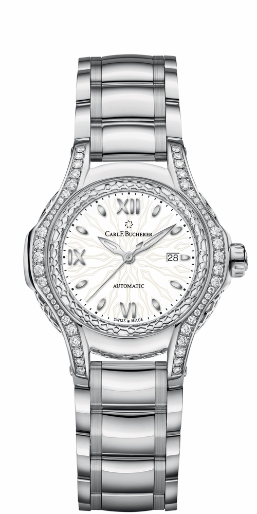 Silver-tone stainless steel case with a silver-tone stainless steel bracelet. Fixed silver-tone diamond set bezel. White dial with silver-tone hands and index-Roman numerals hour markers. Minute markers around the outer rim. Dial Type: Analog. Date display at the 3 o'clock position. Carl F. Bucherer Calibre CFB 1963 automatic movement with a 38-hour power reserve. Scratch resistant sapphire crystal. Pull / push crown. Skeleton transparent exhibition see through case back. Round case shape, case size: 34 mm, case thickness: 9.65 mm. Water resistant at 30 meters / 100 feet. Functions: date, hour, minute, second. Additional Info: case set wtih 54 diamonds. Pathos Diva Series. Luxury watch style. Watch label: Swiss Made. Item Variations: 366.120.7. Carl F. Bucherer Pathos Diva Automatic Ladies Watch 00.10580.08.25.31.01.