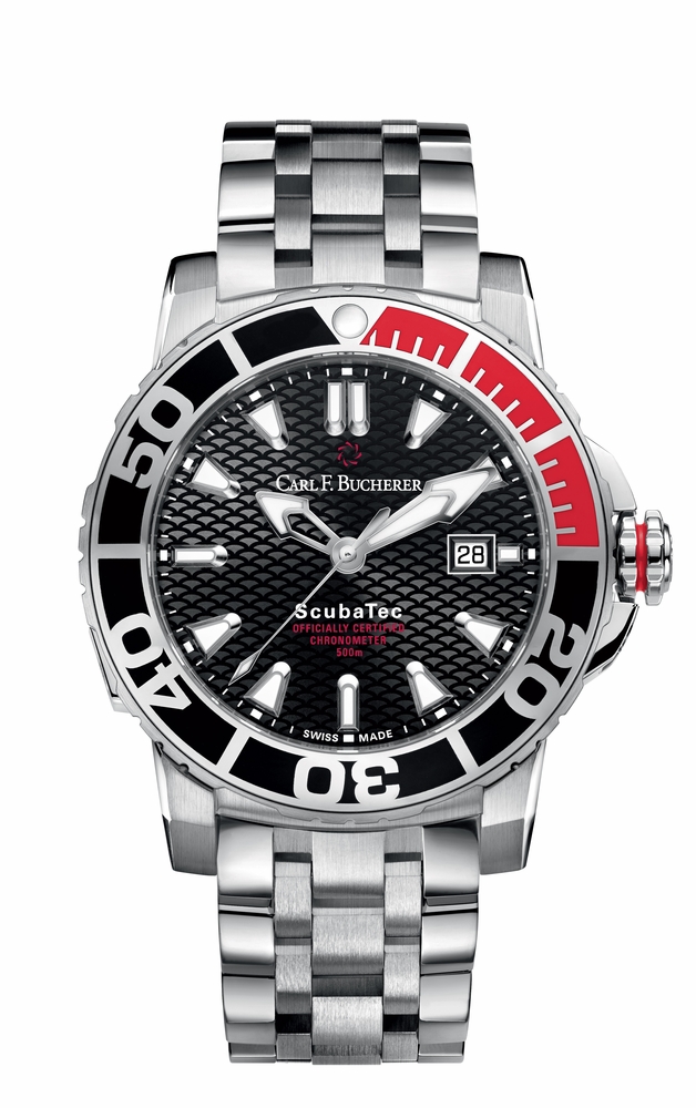 Silver-tone stainless steel case with a silver-tone stainless steel bracelet. Uni-directional rotating black and red (coke) ceramic bezel. Black dial with silver-tone hands and index hour markers. Minute markers around the outer rim. Dial Type: Analog. Luminescent hands and markers. Date display at the 3 o'clock position. Carl F. Bucherer Calibre CFB 1950.1 automatic movement with a 38-hour power reserve. Scratch resistant sapphire crystal. Screw down crown. Round case shape, case size: 44.6 mm, case thickness: 13.45 mm. Water resistant at 500 meters / 1650 feet. Functions: date, hour, minute, second, chronometer. Luxury watch style. Watch label: Swiss Made. Item Variations: 166.269.1. Carl F. Bucherer Patravi Scubatec Automatic Mens Watch 00.10632.23.33.22.