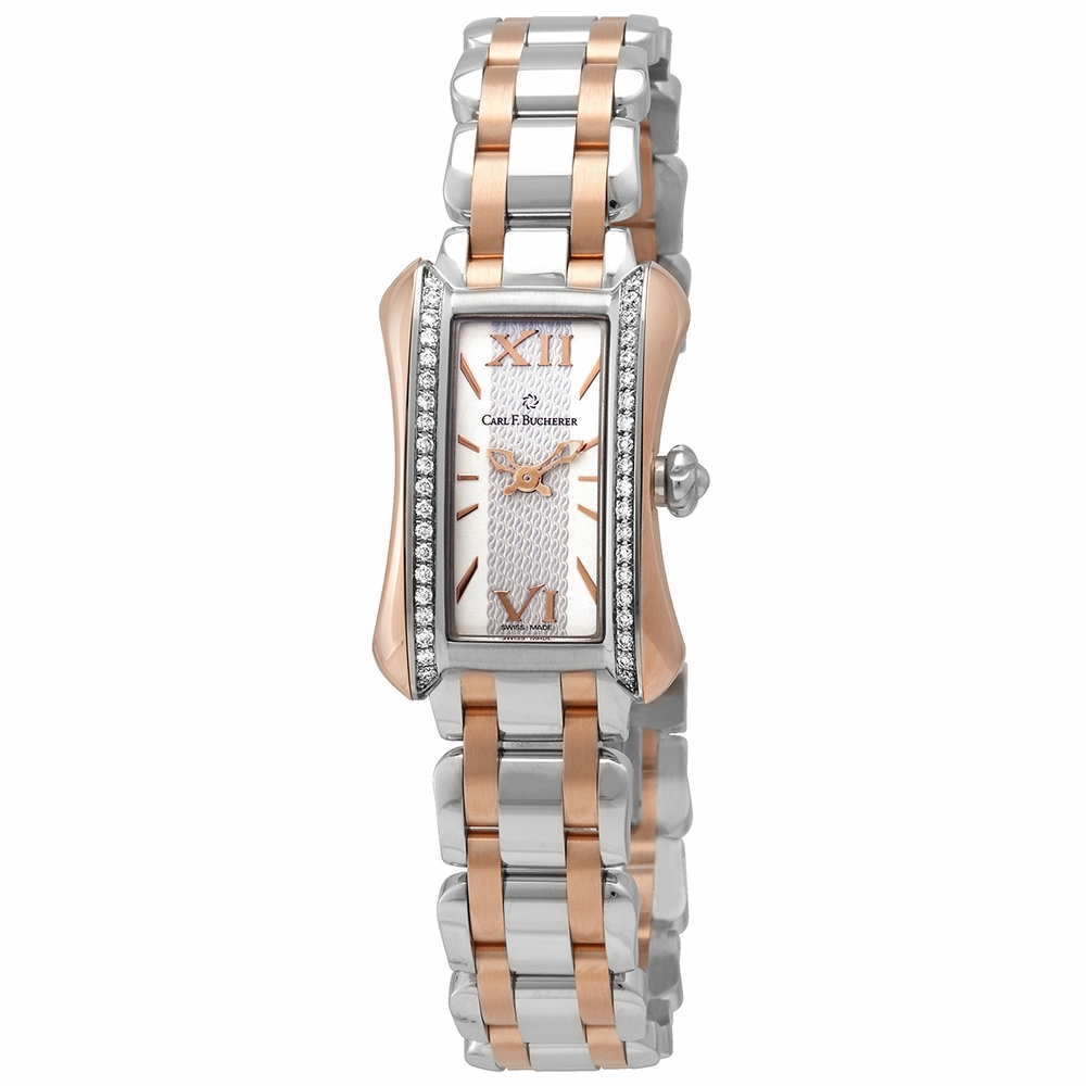 18 carat rose gold case with a 18 carat rose gold and stainless steel bracelet. Fixed- diamond set bezel. Silver dial with rose gold-tone hands and index-Roman numeralss hour markers. Dial Type: Analog. Carl F. Bucherer Calibre CFB 1850 quartz movement. Scratch resistant sapphire crystal. Pull / push crown. Case size: 21 mm x 30 mm. Case thickness: 6.2 mm. Rectangle case shape. Water resistant at 30 meters / 100 feet. Functions: hour, minute. Luxury watch style. Watch label: Swiss Made. Item Variations: 366.355.4. Carl F. Bucherer Alacria Princess Ladies Watch 00.10703.07.15.31.