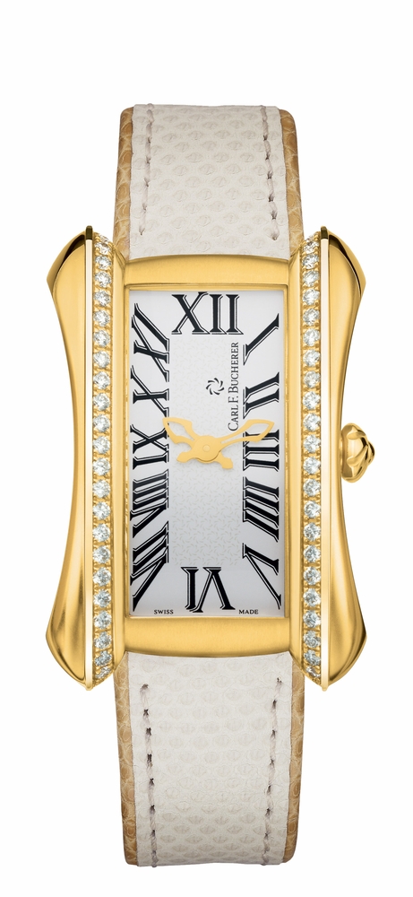 18 carat yellow gold case with a water snake and lizard leather strap. Fixed- diamond set bezel. Silver dial with gold-tone hands and Roman numeral hour markers. Dial Type: Analog. Carl F. Bucherer Calibre CFB 1852 quartz movement. Scratch resistant sapphire crystal. Pull / push crown. Case size: 31.3 mm x 45 mm. Tonneau case shape. Water resistant at 30 meters / 100 feet. Functions: hour, minute. Additional Info: case set with 46 diamonds (1.1 ct). Luxury watch style. Watch label: Swiss Made. Item Variations: 369.383.0. Carl F. Bucherer Alacria Diva Ladies Watch 00.10705.01.21.11.