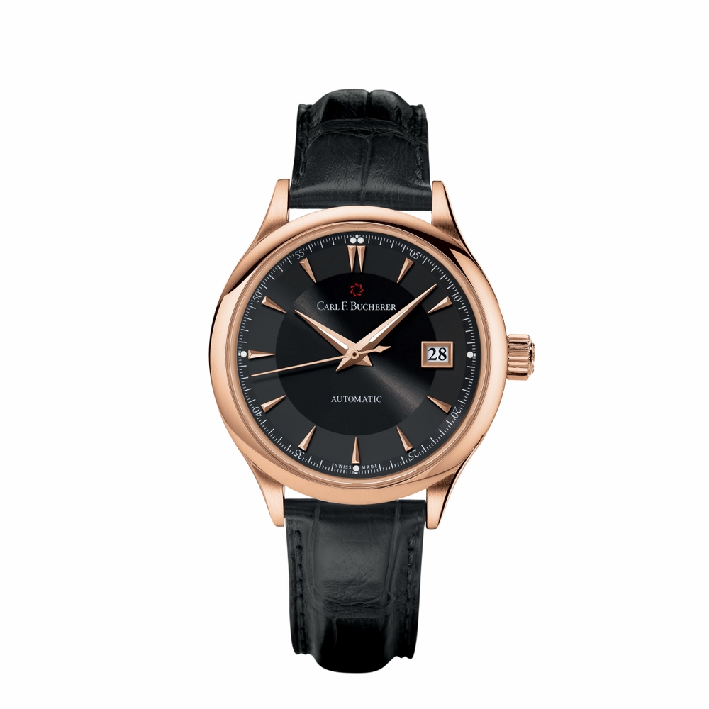 18 carat rose gold case with a black alligator leather strap. Fixed bezel. Black dial with rose gold-tone hands and index hour markers. Minute markers around the outer rim. Dial Type: Analog. Date display at the 3 o'clock position. Carl F. Bucherer Calibre CFB 1965 automatic movement with about 42 hours of power reserve. Scratch resistant sapphire crystal. Case size: 38 mm. Case thickness: 8.75 mm. Round case shape. Water resistant at 30 meters / 100 feet. Functions: date, hour, minute, second. Luxury watch style. Watch label: Swiss Made. Item Variations: 169.009.5. Carl F. Bucherer Manero Automatic Mens Watch 00.10908.03.33.01.