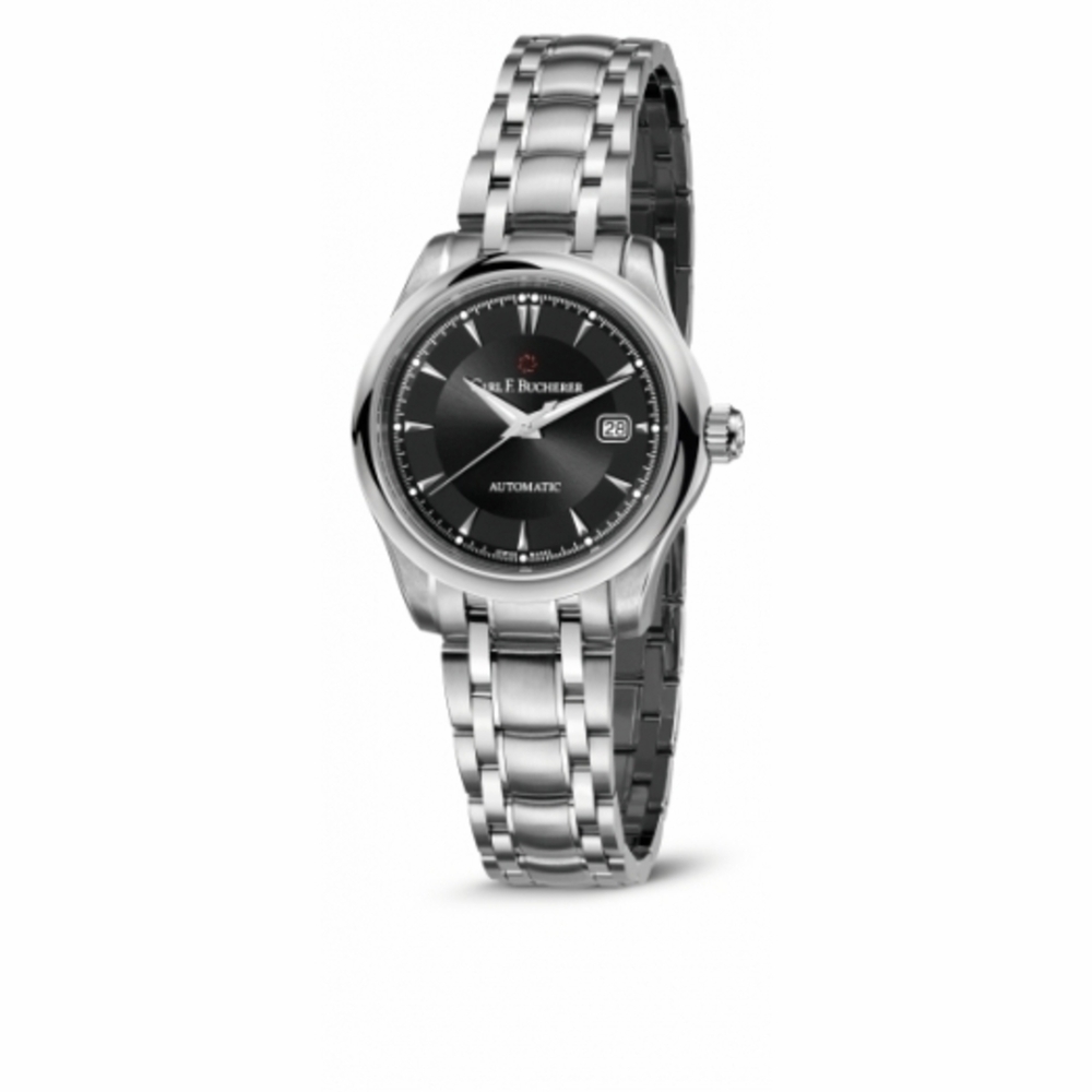 Silver-tone stainless steel case with a silver-tone stainless steel bracelet. Fixed silver-tone stainless steel bezel. Black dial with silver-tone dauphine-style shape hands and index hour markers. Minute markers around the outer rim. Dial Type: Analog. Date display at the 3 o'clock position. Carl F. Bucherer Calibre CFB 1963 automatic movement with a 38-hour power reserve. Scratch resistant sapphire crystal. Pull / push crown. Round case shape, case size: 30 mm. Water resistant at 30 meters / 100 feet. Functions: date, hour, minute, second. Manero Series. Luxury watch style. Watch label: Swiss Made. Item Variations: 366.584.5. Carl F. Bucherer Manero Automatic Mens Watch 00.10911.08.33.21.