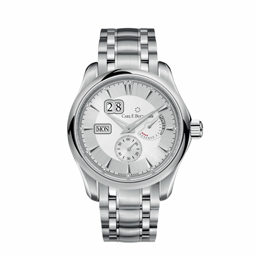 Silver-tone stainless steel case with a silver-tone stainless steel bracelet. Fixed silver-tone stainless steel bezel. Silver dial with silver-tone hands and index hour markers. Minute markers around the outer rim. Dial Type: Analog. Date display at the 9 o'clock position. Two- 60 seconds, power reserve subdials. Carl F. Bucherer Calibre CFB A1011 Automatic movement, containing 33 Jewels, bitting at 21600 vph, and has a power reserve of approximately 55 hours. Scratch resistant sapphire crystal. Pull / push crown. Skeleton transparent exhibition see through case back. Round case shape, case size: 42.5 mm, case thickness: 12.54 mm. Water resistant at 30 meters / 100 feet. Functions: big date, day, hour, minute, small second, power reserve indicator. Manero Series. Luxury watch style. Watch label: Swiss Made. Item Variations: 166.280.6. Carl F. Bucherer Manero Automatic Mens Watch 00.10912.08.13.21.
