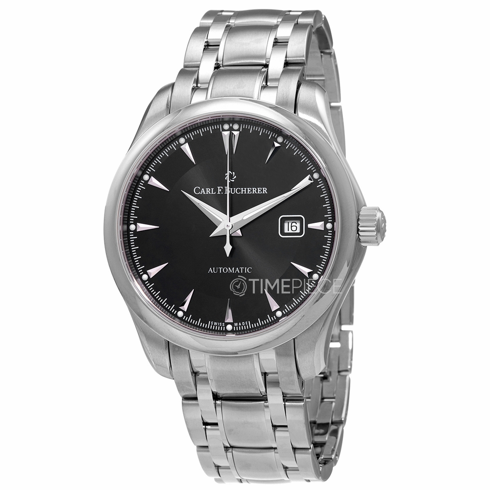 Silver-tone stainless steel case with a silver-tone stainless steel bracelet. Fixed silver-tone stainless steel bezel. Black dial with silver-tone dauphine-style shape hands and index hour markers. Minute markers around the outer rim. Dial Type: Analog. Luminescent hands and markers. Date display at the 3 o'clock position. Carl F. Bucherer Calibre CFB 1950 Automatic movement, containing 26 Jewels, bitting at 28800 vph, and has a power reserve of approximately 38 hours. Scratch resistant sapphire crystal. Pull / push crown. Skeleton transparent exhibition see through case back. Round case shape, case size: 42 mm, case thickness: 11.98 mm. Water resistant at 30 meters / 100 feet. Functions: date, hour, minute, second. Manero Series. Luxury watch style. Watch label: Swiss Made. Item Variations: 166.257.7. Carl F. Bucherer Manero Automatic Mens Watch 00.10915.08.33.21.