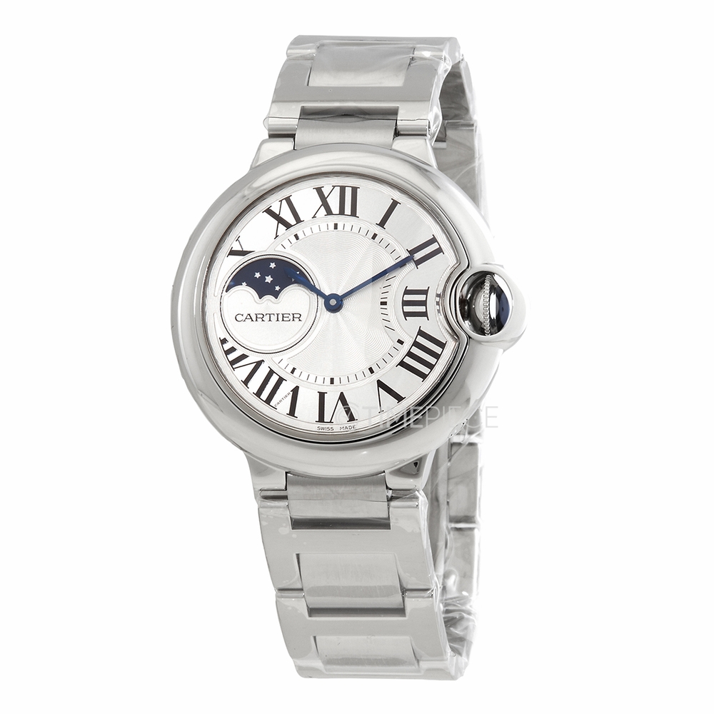 Silver-tone stainless steel case and bracelet. Fixed silver-tone stainless steel bezel. Silver (guilloche) dial with blued-steel sword-shaped hands and Roman numeral hour markers. Minute scale around the inner rim. Dial Type: Analog. One subdial displaying: moon phase. Automatic movement. Scratch resistant sapphire crystal. Fluted crown, set with synthetic cabochon spinel. Solid case back. Round case shape, case size: 37 mm, case thickness: 13 mm. Deployment clasp. Water resistant at 30 meters / 100 feet. Functions: moonphase, hour, minute. Ballon Bleu Series. Luxury watch style. Watch label: Swiss Made. Cartier Ballon Bleu Automatic Silver Dial Ladies Watch WSBB0050.